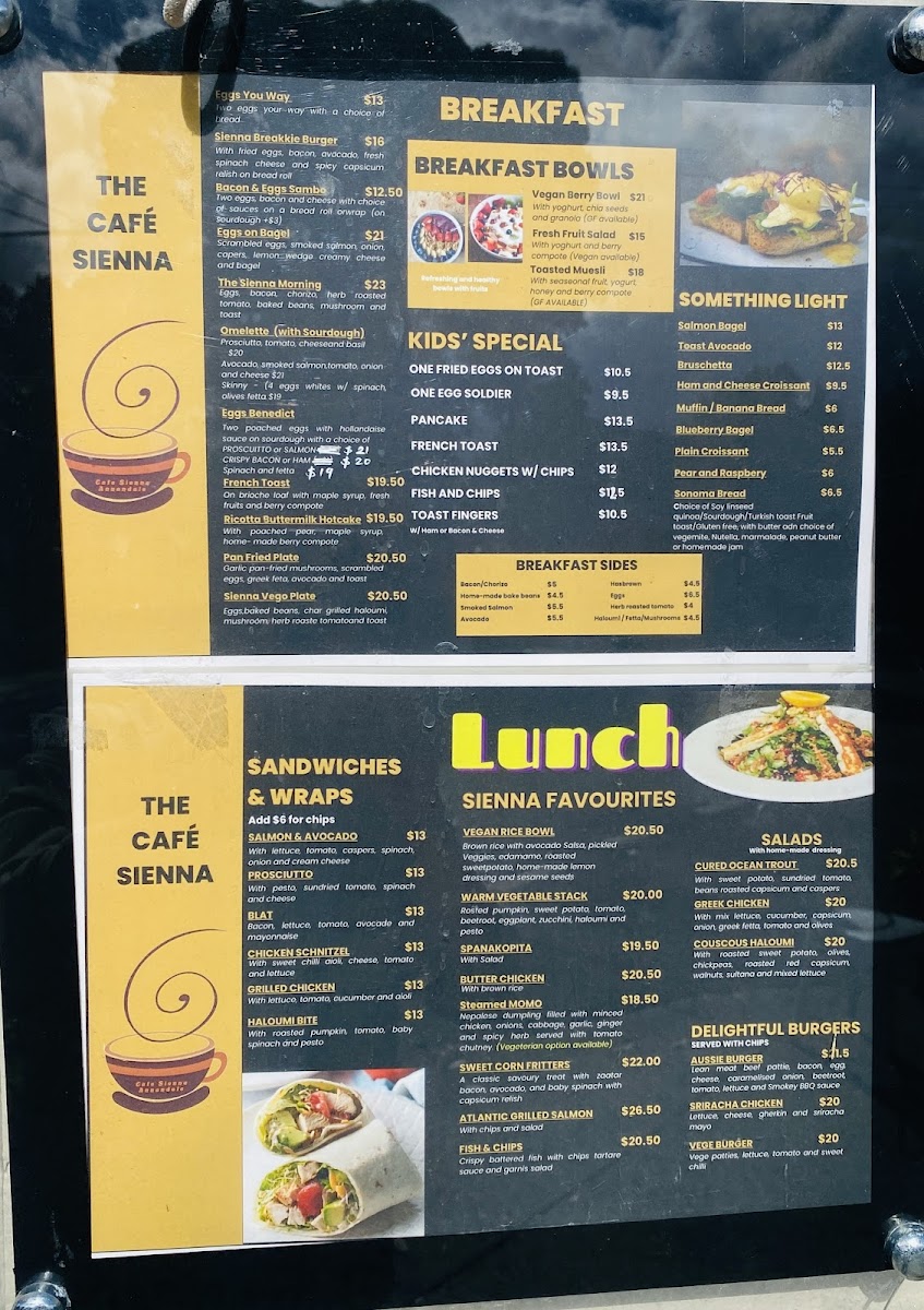 Welcome to The Cafe Sienna, located at 61 Annandale St, Annandale NSW. This charming cafe captures the essence of the inner west, providing a delightful escape with warm hospitality and an inviting ambiance. The menu is thoughtfully curated, featuring delectable sandwiches and wraps such as the Salmon & Avocado and Chicken Schnitzel, both priced at A$13.00.